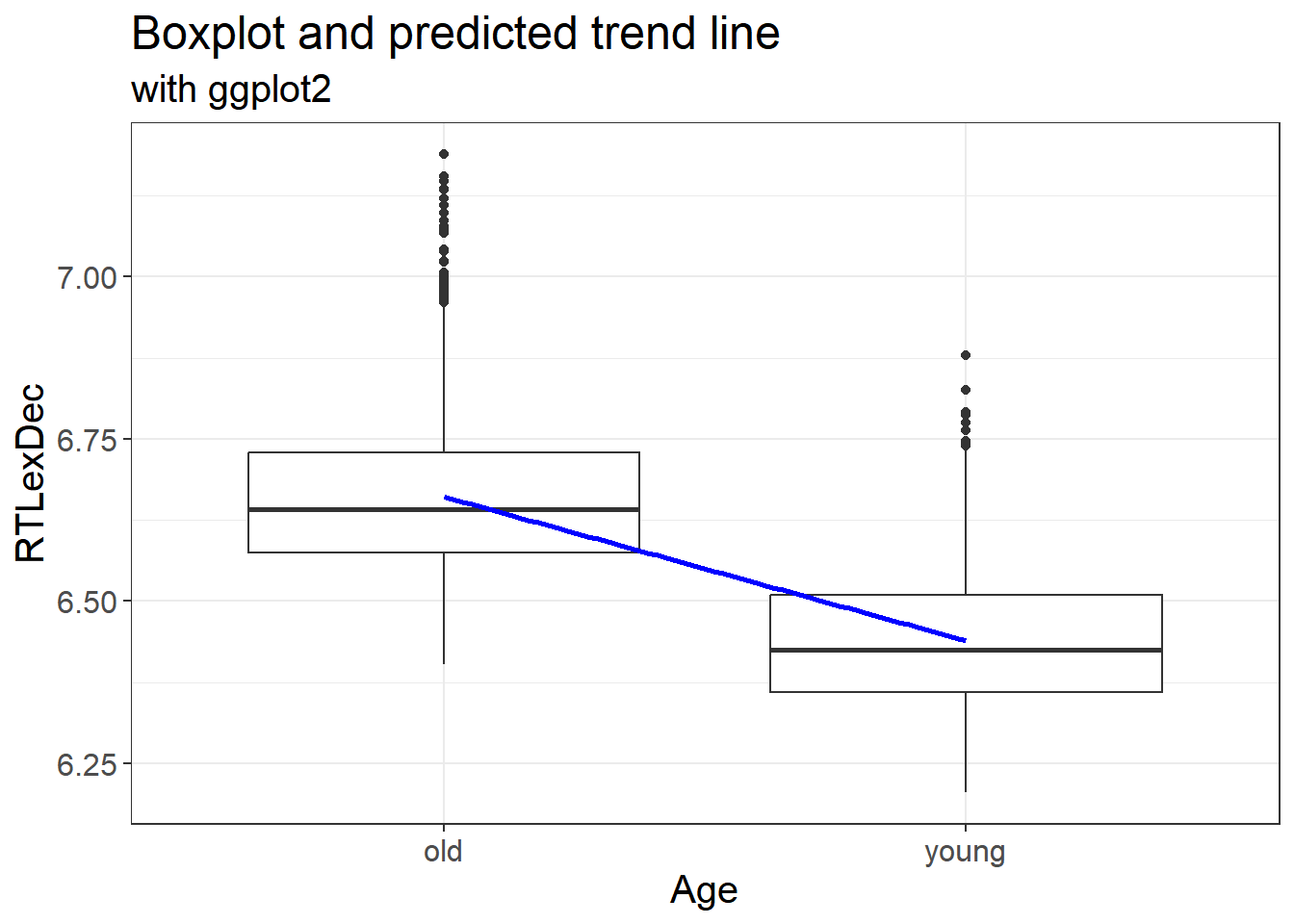 labs(x = "Age", y = "RTLexDec", title = "Boxplot and predicted trend line", subtitle = "with ggplot2")