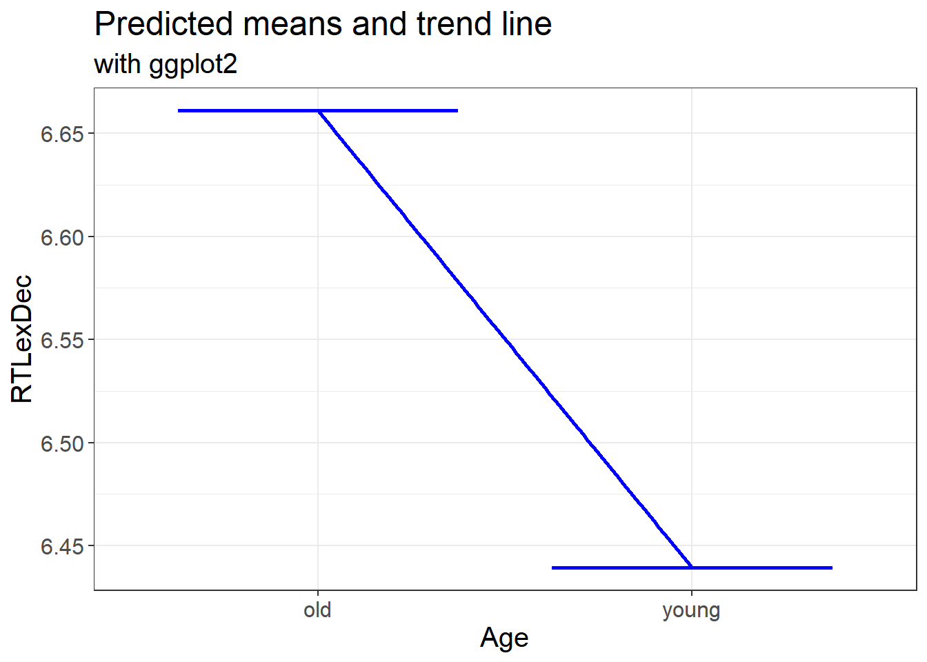 labs(x = "Age", y = "RTLexDec", title = "Predicted means and trend line", subtitle = "with ggplot2")