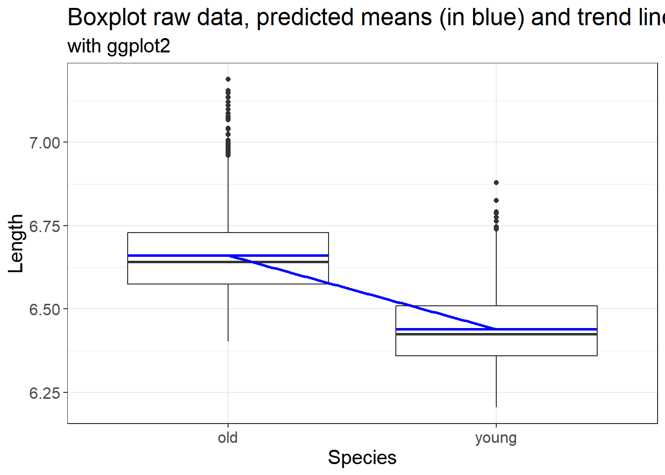 labs(x = "Species", y = "Length", title = "Boxplot raw data, predicted means (in blue) and trend line", subtitle = "with ggplot2")