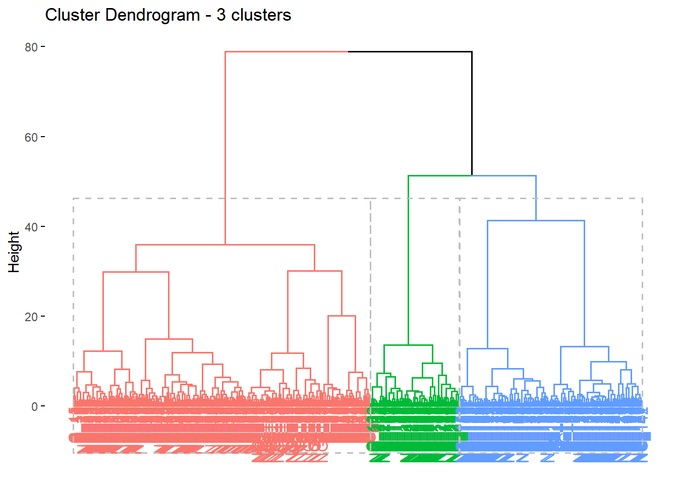 fviz_dend(km.resdat1_3, show_labels = TRUE, rect = TRUE, repel = TRUE, main = "Cluster Dendrogram - 3 clusters")