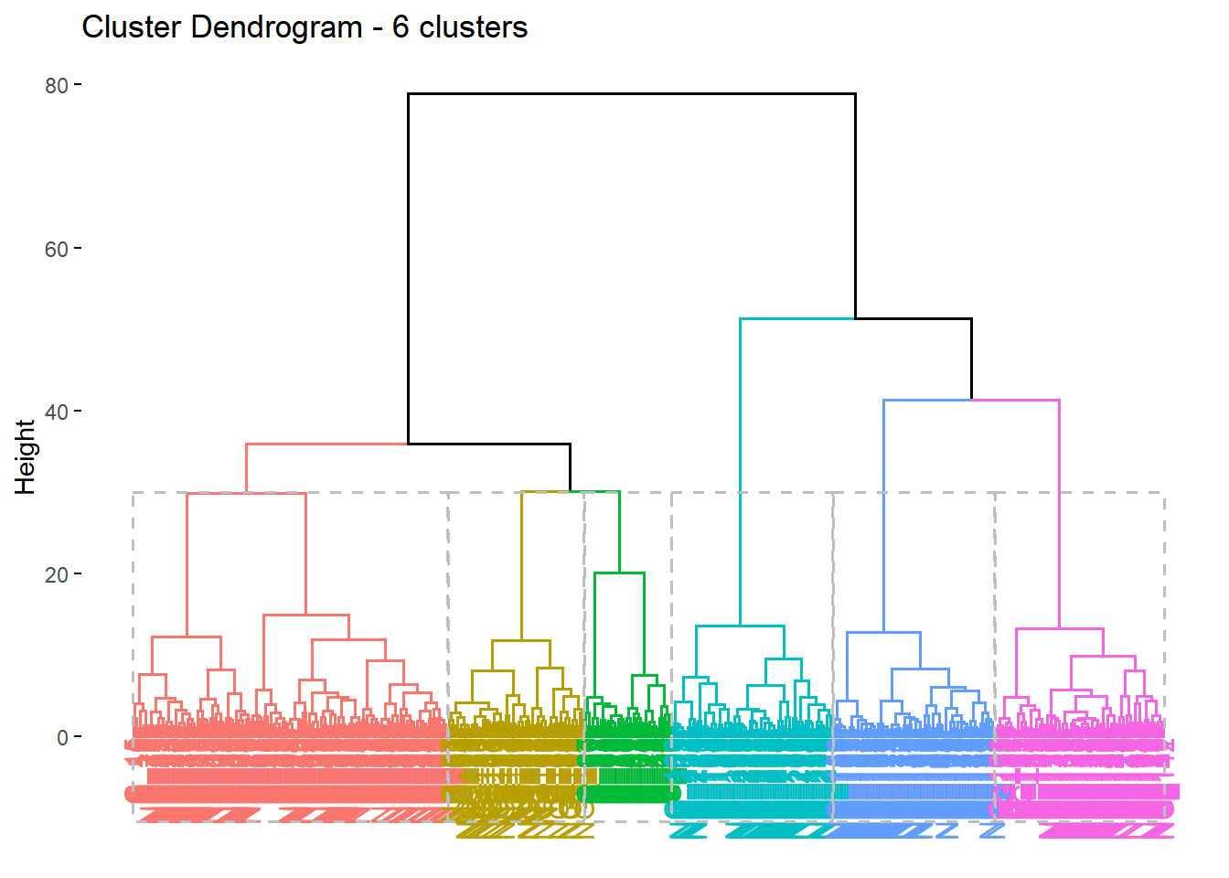 fviz_dend(km.resdat1_6, show_labels = TRUE, rect = TRUE, repel = TRUE, main = "Cluster Dendrogram - 6 clusters")