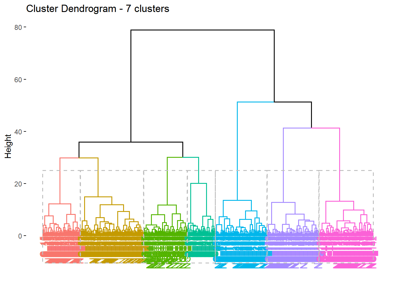 fviz_dend(km.resdat1_7, show_labels = TRUE, rect = TRUE, repel = TRUE, main = "Cluster Dendrogram - 7 clusters")