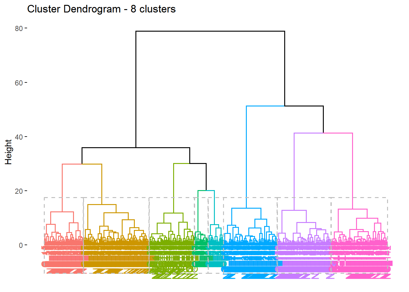 fviz_dend(km.resdat1_8, show_labels = TRUE, rect = TRUE, repel = TRUE, main = "Cluster Dendrogram - 8 clusters")