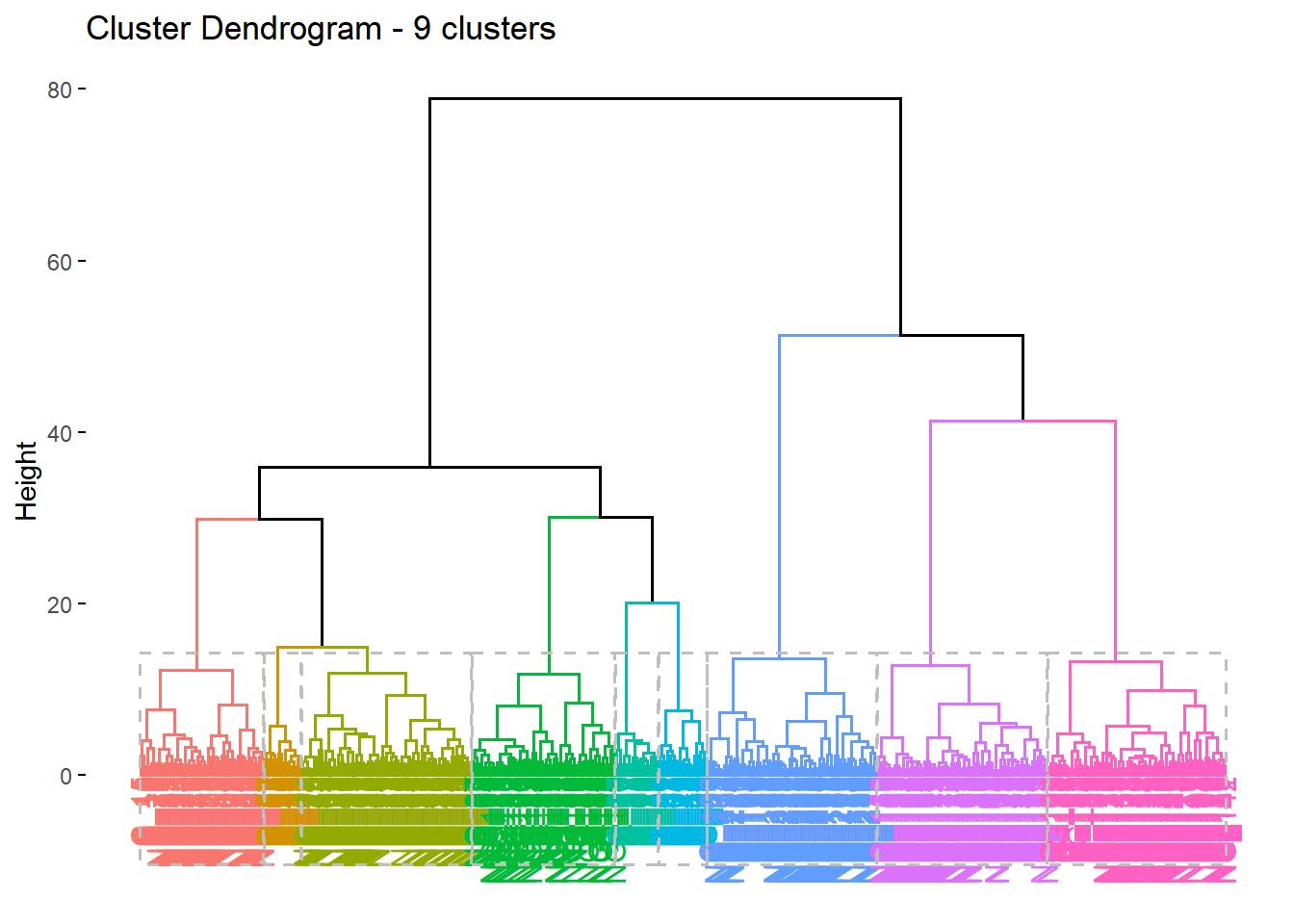 fviz_dend(km.resdat1_9, show_labels = TRUE, rect = TRUE, repel = TRUE, main = "Cluster Dendrogram - 9 clusters")