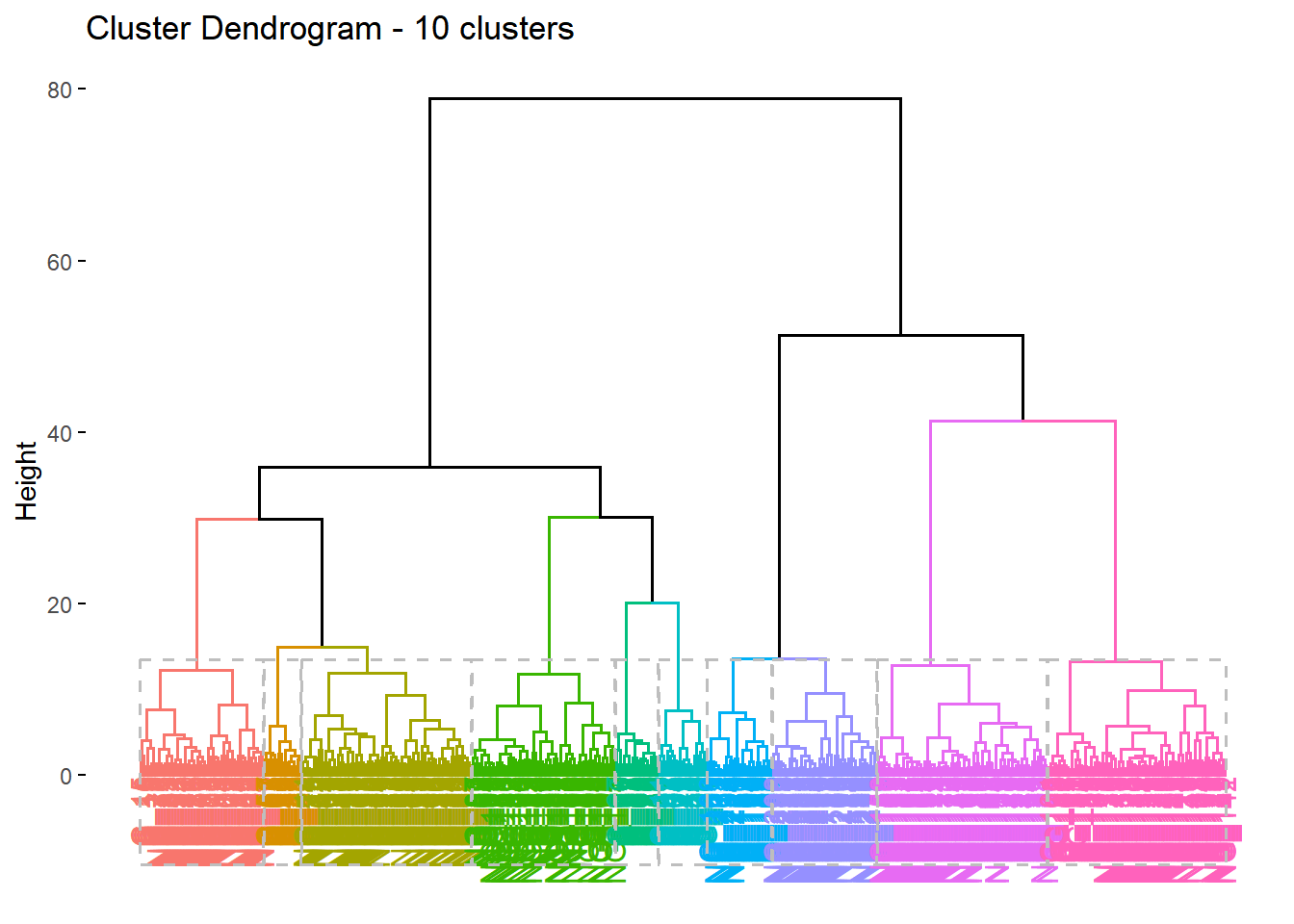 fviz_dend(km.resdat1_10, show_labels = TRUE, rect = TRUE, repel = TRUE, main = "Cluster Dendrogram - 10 clusters")