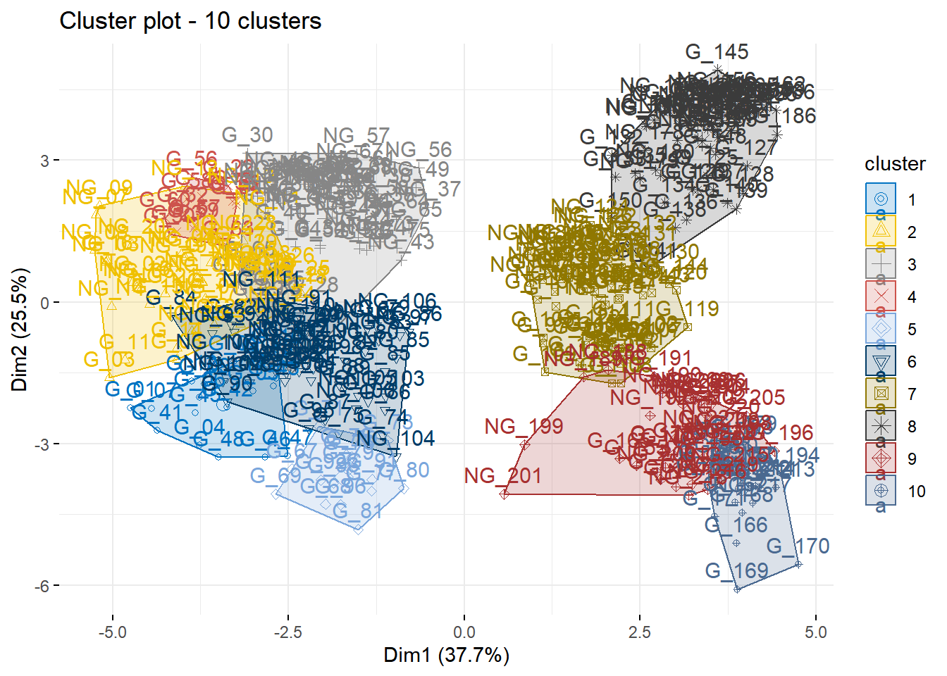 The results in the plot above show that the optimal number of clusters is 10! This is not helpful at all; for the moment, this is for demonstration.